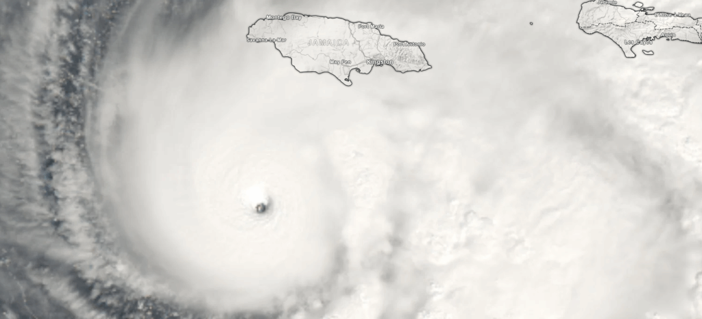 Con vientos sostenidos de 260 kilómetros por hora, Melissa se convirtió en el huracán más potente en la historia reciente en golpear directamente a la isla caribeña. Su centro se encontraba a 220 kilómetros al suroeste de Kingston, moviéndose hacia el oeste a solo 5 km/h.