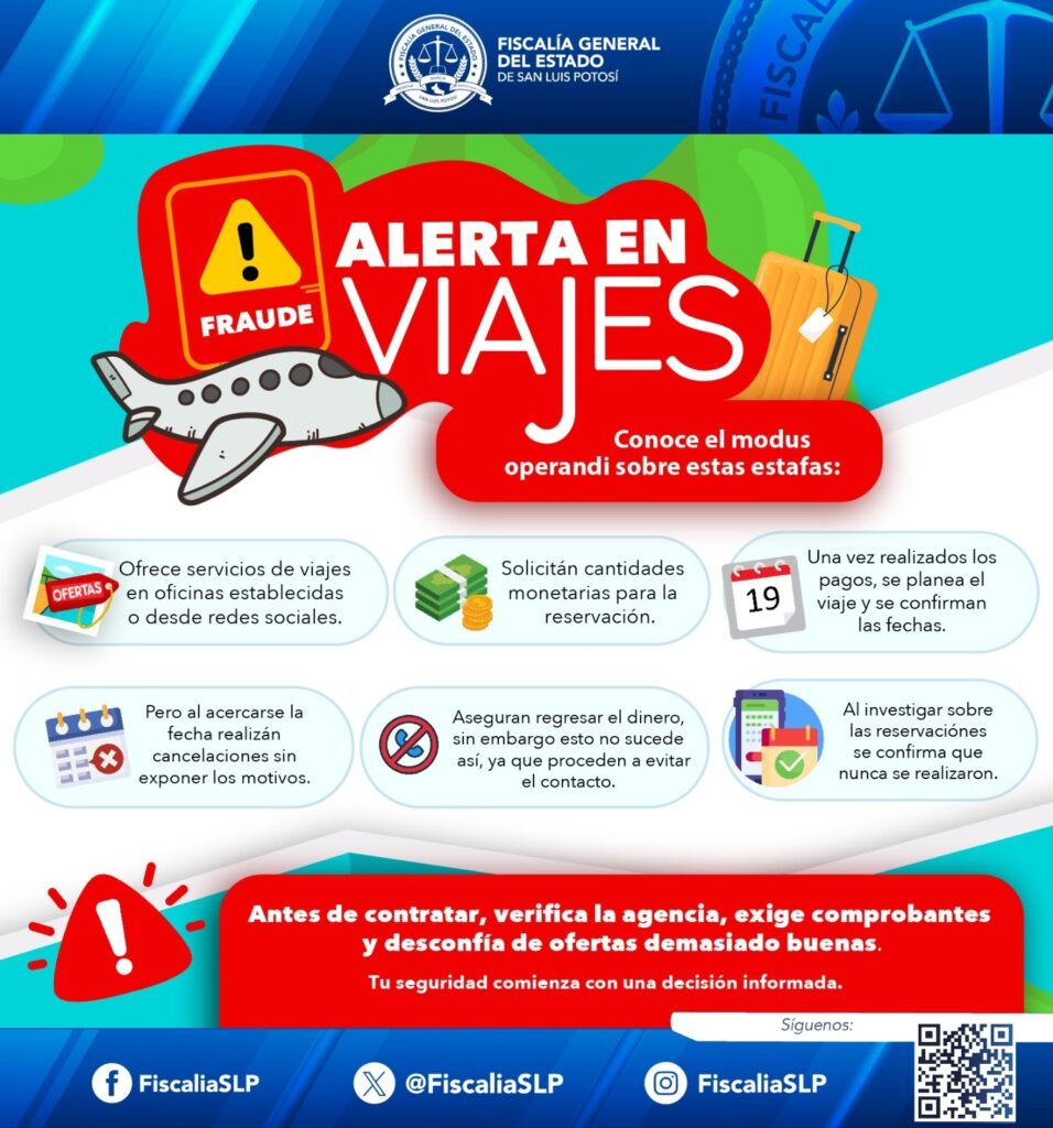 San Luis Potosí, S.L.P., jueves 16 de octubre de 2025.- La Fiscalía General del Estado de San Luis Potosí (FGESLP) advirtió a la ciudadanía sobre un esquema de fraude que se ha detectado en redes sociales y plataformas digitales, donde se ofrecen paquetes vacacionales a precios inusualmente bajos para atraer víctimas.