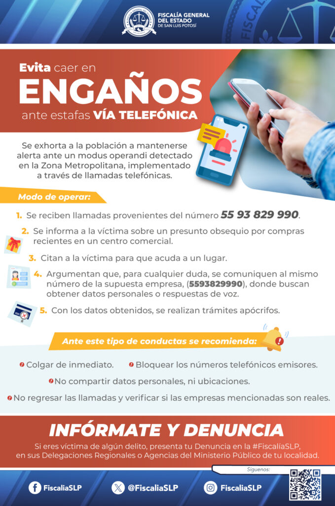 San Luis Potosí, S.LP., miércoles 22 de octubre de 2025.- La Fiscalía General del Estado de San Luis Potosí exhortó a la población a mantenerse alerta ante un nuevo modus operandi detectado en la Zona Metropolitana, relacionado con estafas telefónicas.