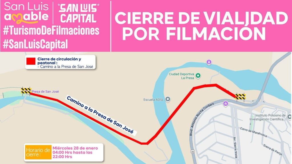 San Luis Potosí, S.L.P., martes 27 de enero de 2026.- Autoridades informaron que el Camino a la Presa de San José permanecerá completamente cerrado debido a trabajos de filmación el próximo miércoles 28 de enero desde las 4:00 am hasta las 22:00 hrs., por lo que se exhorta a la población a tomar precauciones y planear rutas alternas.