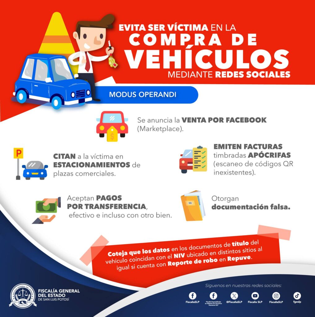 San Luis Potosí, S.L.P., lunes 03 de noviembre de 2025.- La Fiscalía General del Estado de San Luis Potosí emitió una alerta preventiva ante el incremento de fraudes en la compraventa de vehículos a través de redes sociales, principalmente en plataformas como Facebook Marketplace.