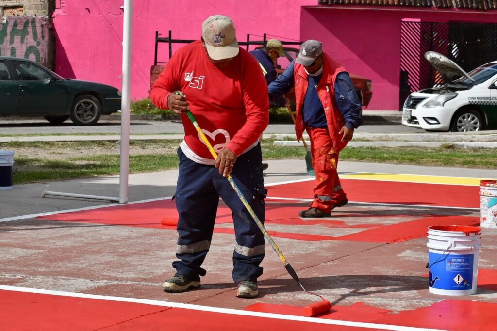 Cuadrillas de la Coordinación de Imagen Urbana regresaron al parque ubicado en las calles Roca y Fertilizantes, donde trabajaron en la pintura de la cancha, con el objetivo de que todos los vecinos, principalmente niños y jóvenes, cuenten con un espacio digno y en mejores condiciones para la recreación y el deporte.