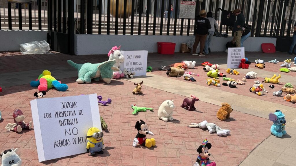 San Luis Potosí, S.L.P., viernes 17 de abril de 2026.– En el marco del Día Internacional de la Lucha contra el Maltrato Infantil, las organizaciones No Más Hijos Rehenes México A.C. y la Fundación Internacional Granito de Arena realizaron una manifestación pacífica frente al Poder Judicial del Estado, donde colocaron decenas de peluches como símbolo de las infancias que, aseguran, han sido invisibilizadas por el sistema judicial.