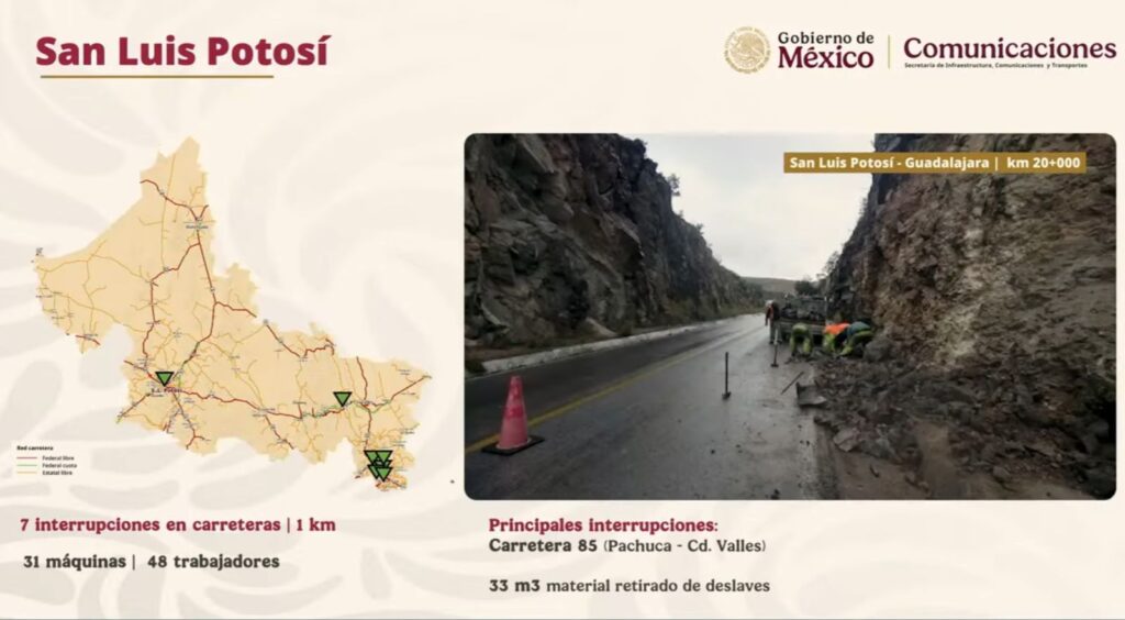 En territorio potosino se contabilizaron siete cortes viales, principalmente en la carretera Pachuca–Ciudad Valles y en el tramo San Juan del Río–Xilitla.Finalmente, las autoridades estatales confirmaron que el servicio eléctrico se encuentra completamente restablecido, luego de los trabajos de reparación realizados durante el fin de semana en las zonas que presentaron fallas.