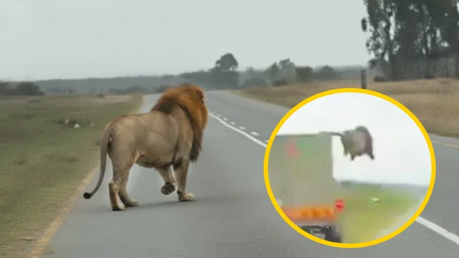 Sudáfrica., viernes 24 de octubre de 2025.- Un león escapó de un camión en movimiento en una carretera de Sudáfrica, protagonizando una escena tan sorprendente como peligrosa que rápidamente se volvió viral en redes sociales.