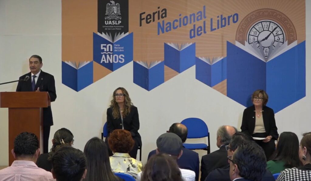 San Luis Potosí, S.L.P., viernes 13 de marzo de 2026.– La Feria Nacional del Libro de la UASLP inició su edición número 50 con un acto inaugural encabezado por autoridades de la Universidad Autónoma de San Luis Potosí, quienes destacaron la permanencia de este encuentro editorial que, durante cinco décadas, se ha consolidado como uno de los eventos culturales más representativos de la entidad.