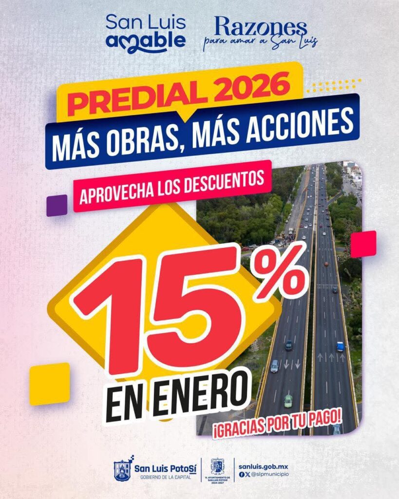 San Luis Potosí, S.L.P., viernes 02 de enero de 2026.- El Gobierno de la Capital de San Luis Potosí lanzó la campaña del Predial 2026, con la que invita a la ciudadanía a aprovechar un descuento del 15 por ciento durante el mes de enero, como parte de los incentivos para quienes cumplen puntualmente con esta contribución.