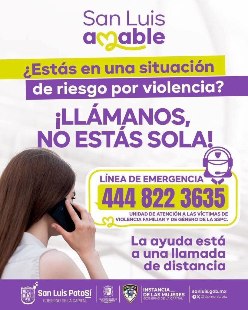 San Luis Potosí, S.L.P., viernes 14 de agosto de 2025.- El Ayuntamiento de San Luis Potosí, a través de la Instancia de las Mujeres y la Secretaría de Seguridad y Protección Ciudadana (SSPC), difundió una campaña informativa para reforzar la atención a víctimas de violencia familiar y de género. La iniciativa recuerda a las mujeres que se encuentren en riesgo que no están solas y que pueden solicitar ayuda inmediata a través de la línea de emergencia 444 822 3635.