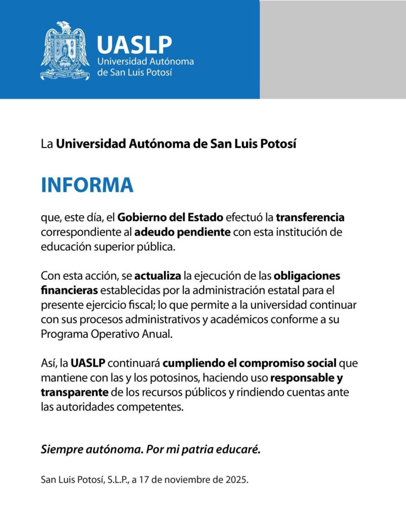 San Luis Potosí, S.L.P., lunes 17 de noviembre de 2025.- La Universidad Autónoma de San Luis Potosí (UASLP) confirmó que el Gobierno del Estado realizó la transferencia del adeudo pendiente que mantenía con la institución, lo que permite regularizar las obligaciones financieras del ejercicio fiscal y garantizar la continuidad de los procesos administrativos y académicos previstos en su Programa Operativo Anual.