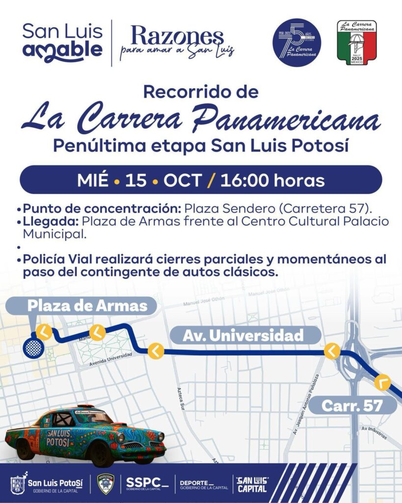 San Luis Potosí, S.L.P., martes 14 de octubre de 2025.– La Carrera Panamericana, uno de los eventos automovilísticos más importantes a nivel internacional, llegará mañana a San Luis Potosí, consolidando al municipio como una de sus sedes principales.