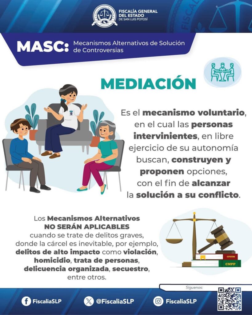San Luis Potosí, S.L.P., martes 18 de noviembre de 2025.- La Fiscalía General del Estado de San Luis Potosí difundió recientemente una serie de avisos para informar a la ciudadanía sobre la mediación, uno de los Mecanismos Alternativos de Solución de Controversias (MASC) disponibles para atender conflictos de manera ágil, voluntaria y sin necesidad de llegar a juicio.