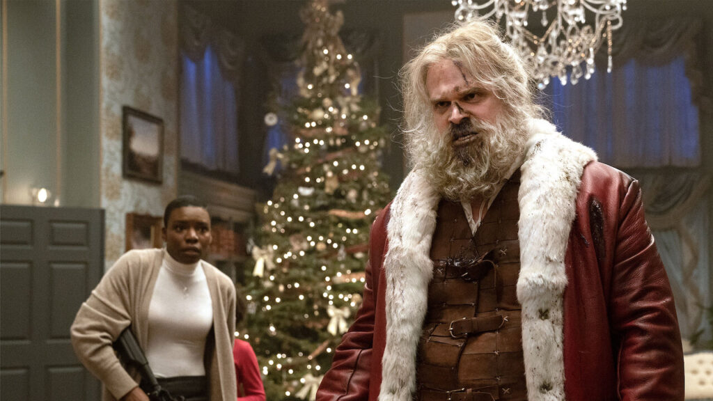 En un registro completamente opuesto, Noche sin paz (Tommy Wirkola, 2022) propone una versión violenta y desmitificada de Santa Claus. La trama arranca cuando un grupo de mercenarios irrumpe en la mansión de una familia adinerada durante la Nochebuena. Lo que no anticipan es la presencia de un Papá Noel muy distinto al tradicional, interpretado por David Harbour, cansado, rudo y dispuesto a recurrir a la fuerza para salvar a los rehenes. La película combina acción, humor negro y una lectura irónica del mito navideño, convirtiendo a Santa en un improbable héroe de combate.