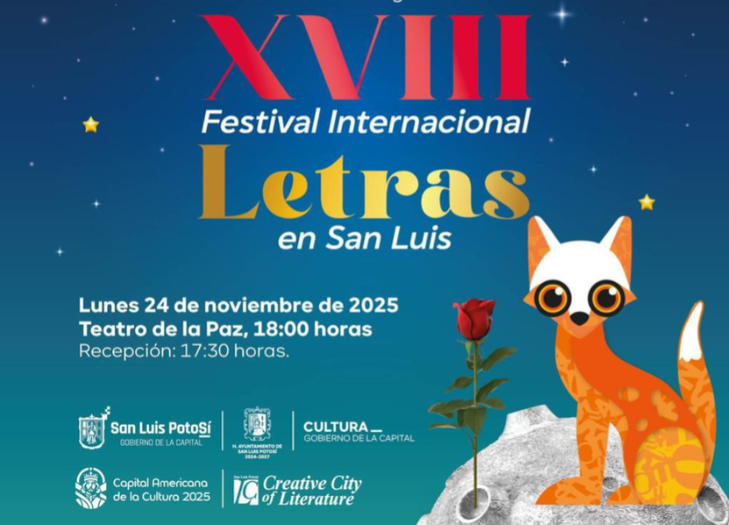 San Luis Potosí, S.L.P., domingo 23 de noviembre de 2025.– La capital potosina se prepara para la gran inauguración oficial del XVIII Festival Internacional Letras en San Luis, que este año estará marcado por un hecho histórico: la presentación del reconocimiento de la UNESCO que acredita a San Luis Potosí como Ciudad Creativa por Literatura. El anuncio se realizará este domingo en el Teatro de la Paz, consolidando a la ciudad como un referente cultural en el país.