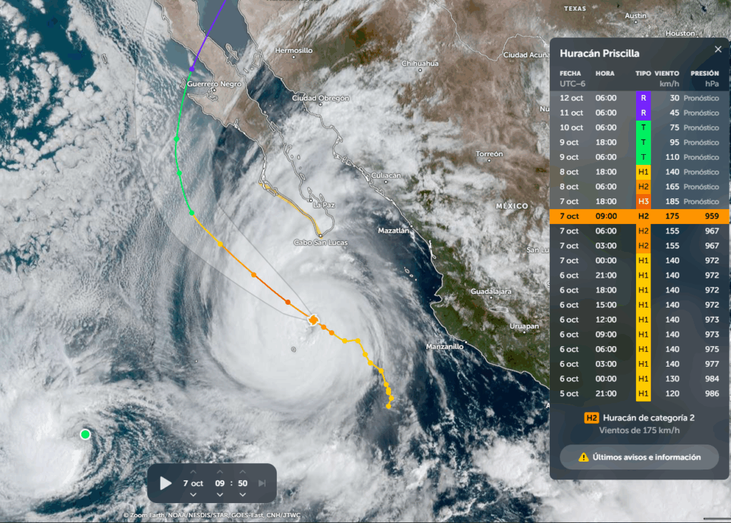 San Luis Potosí, S.L.P., martes 07 de octubre de 2025.- El huracán Priscilla se intensificó a categoría 2 en la escala Saffir-Simpson, informó el Servicio Meteorológico Nacional (SMN) de la Comisión Nacional del Agua (Conagua).