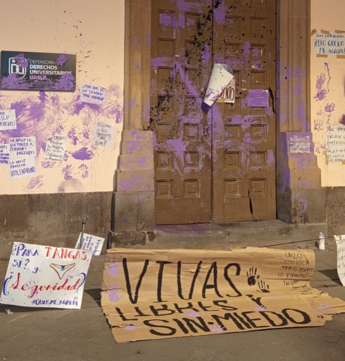 Durante la protesta, integrantes de colectivas intervinieron las instalaciones de la Defensoría de Derechos Humanos de la UASLP, donde realizaron pintas con consignas de denuncia por presuntos escándalos en el gasto universitario y mensajes de apoyo como “vivas, libres y sin miedo”. La acción ocurrió en el contexto del señalamiento contra un docente de la Facultad de Ciencias, previamente denunciado por una exalumna por presunta agresión.