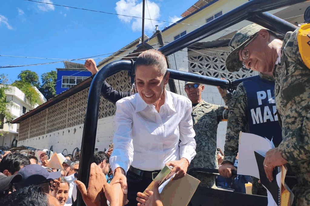 La presidenta visitó los domicilios de los afectados y ofreció un mensaje desde un templete improvisado en la batea de una unidad del Ejército Mexicano, donde aseguró que “a nadie se va a dejar abandonado” y que todas las familias recibirán apoyo.