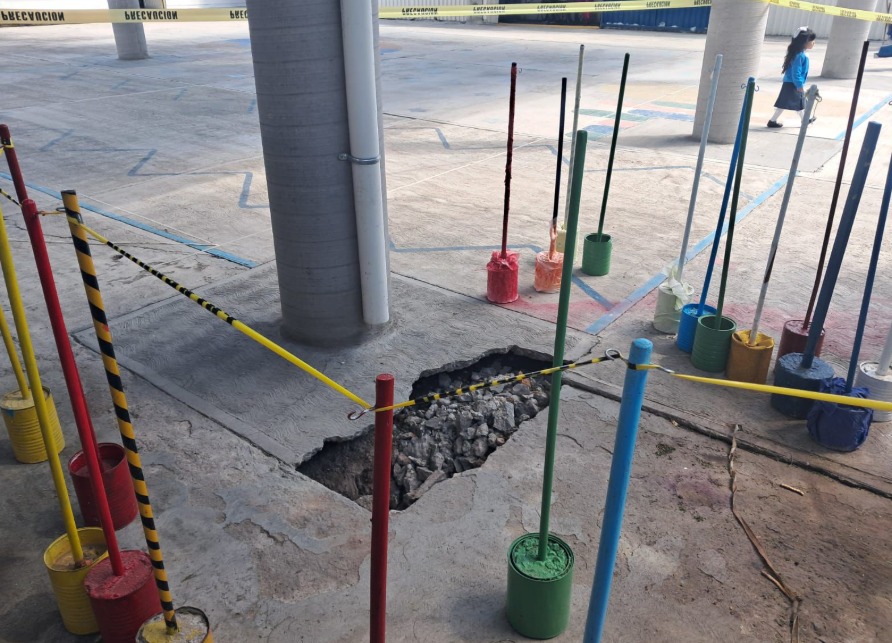 Explicaron que, hace poco más de una semana, en el patio principal apareció un socavón, razón por la que se tomó la decisión se suspender todas las actividades en el plantel hasta que las autoridades competentes acudieran e hicieran la revisión necesaria para descartar riesgos mayores o, de ser necesario, se implementaran las acciones adecuadas para atender el fenómeno y garantizar la seguridad de alumnos y docentes.