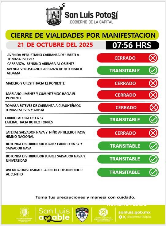 La Secretaría de Seguridad y Protección Ciudadana (SSPC) informó, con corte a las 7:56 horas, que permanecen cerradas las vialidades de Venustiano Carranza de Uresti a Tomasa Estévez, Mariano Jiménez y Cuauhtémoc hacia el poniente, así como la lateral de Salvador Nava Martínez y Niño Artillero en dirección a Himno Nacional.