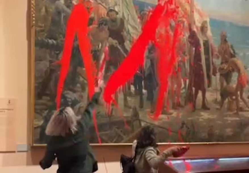 Madrid, España, lunes 13 de octubre de 2025.– Dos integrantes del colectivo ambiental Futuro Vegetal realizaron una protesta este sábado en el Museo Naval de Madrid, donde lanzaron pintura biodegradable roja sobre el cuadro Primer homenaje a Cristóbal Colón, del artista José Garnelo, para denunciar la conmemoración del 12 de octubre.
